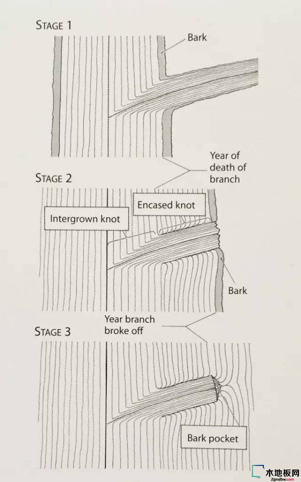 圖中所示節(jié)疤的生長過程。樹木而言,其側(cè)枝或休眠芽內(nèi)的形成層與樹干的形成層逐漸分生就會(huì)形成樹節(jié)。雖然有些樹節(jié)會(huì)造成木頭的不穩(wěn)定性,但它們也能營造獨(dú)具一格的藝術(shù)效果。